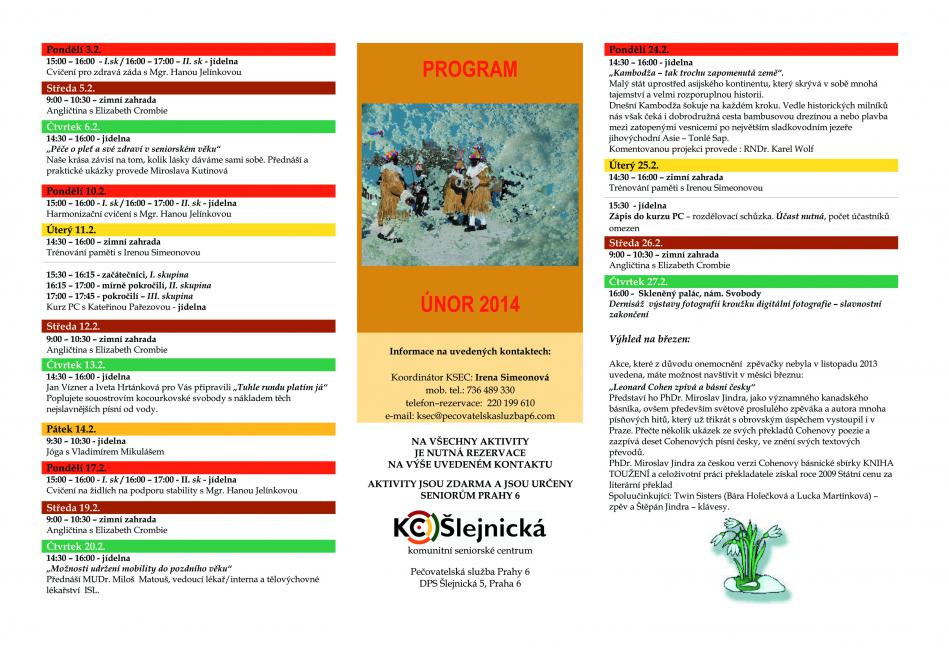 Program KSEC, Šlejnická 5, Praha 6 na měsíc únor 2014, kde jsou aktivizační programy pro seniory (rehabilitační cvičení, jóga, trénování paměti,...), kurzy PC, odborné přednášky nebo kuturní akce pro seniory Prahy 6.