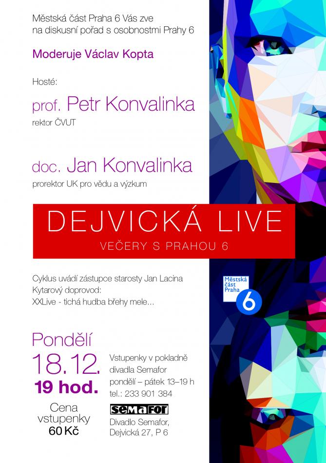 Srdečně Vás zveme na populární diskusní setkání s významnými osobnostmi Prahy 6, kde hosty Václava Kopty a zástupce starosty Jana Laciny bude rektor ČVUT prof. Petr KONVALINKA a prorektor UK pro vědu a výzkum doc. Jan KONVALINKA.