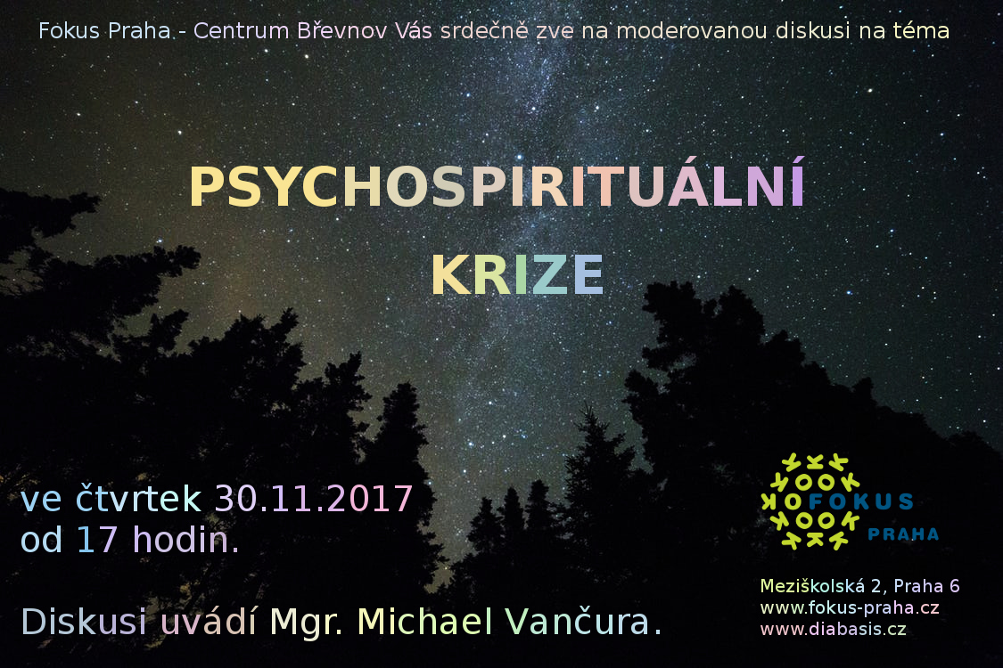 Zveme odbornou veřejnost a všechny, kdo mají co dodat k tématu psychospirituální krize nebo se o ní chtějí více dozvědět, aby přišli ve čtvrtek 30.11.2017 v 17 hodin na diskusi, moderovanou Mgr. Michaelem Vančurou, zakladatelem sdružení Diabasis. Jsme rádi, že právě on přijal naše pozvání a těšíme se na inspirativní diskusní podvečer.