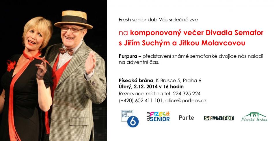Fresh senior klub Vás srdečně zve na komponovaný večer Divadla Semafor s Jiřím Suchým a Jitkou Molavcovou do Písecké brány 2.12. od 16 hodin.