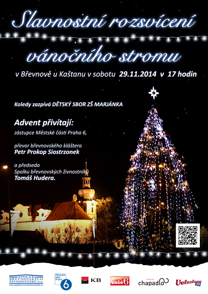 v ulici Bělohorská u Kaštanu. Rozsvícení 29.11.2014 v 17:00, občerstvení již od 16:00. Koledy zazpívá pěvecký sbor ZŠ Marjánka.