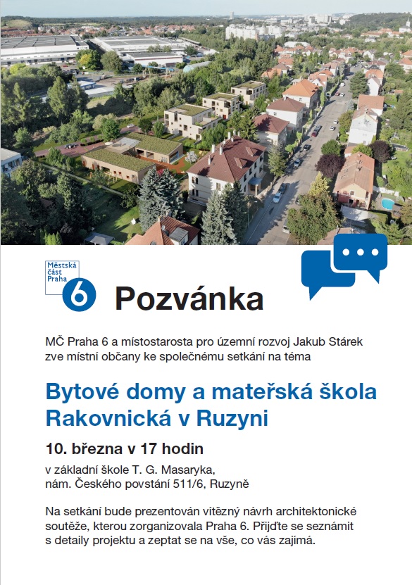 Zajímá vás, jak bude vypadat finální podoba bytových domů a MŠ Rakovnická v Ruzyni? Přijďte na veřejné setkání se zástupci radnice v ZŠ T. G. Masaryka (Ruzyň) ve čtvrtek 10. března podvečer.