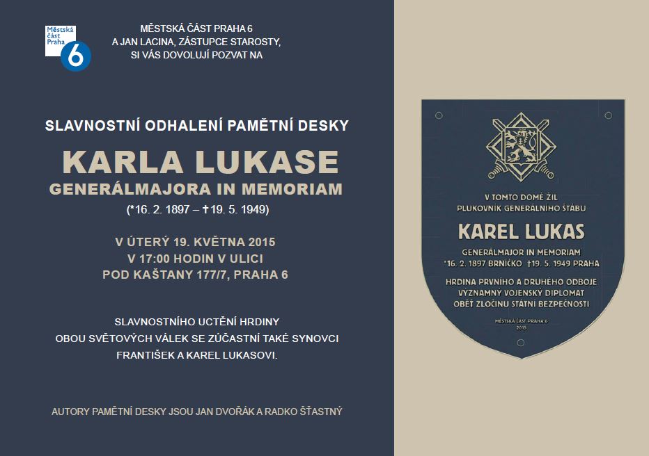 MČ Praha 6 a zástupce starosty Jan Lacina si vás dovolují pozvat na slavnostní odhalení pamětní desky KARLA LUKASE, generálmajora in memoriam, které se uskuteční v úterý 19. května 2015 v 17:00 hodin v ulici Pod kaštany 177/7, Praha 6.