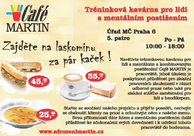 V pondělí 4. 2. 2013 v 15:00 hodin bude slavnostně otevřena tréninková kavárna Café MARTIN v budově městského úřadu Prahy 6 v ulici Čs. armády 23/601. Vznik této tréninkové kavárny je podpořen městskou částí Praha 6. Otevírací doba kavárny kopíruje otevírací dobu úřadu.