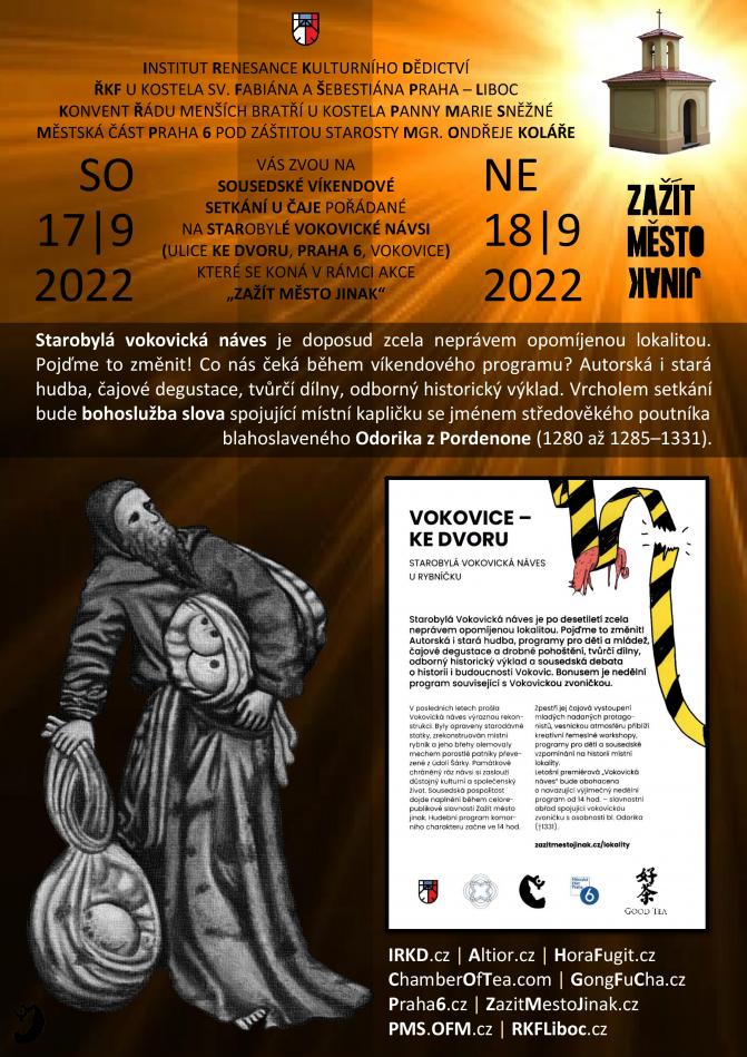 V rámci akce "Zažít město jinak" se koná dvoudenní sousedské setkání na starobylé vokovické návsi. Pro příchozí je připraveno čajové pohoštění, hudba i tvůrčí dílny. V neděli se koná výjimečný liturgický obřad, kdy zdejší zvonička - dosposud bez zasvěcení - bude spojena se jménem středověkého poutníka a františkánského mnicha bl. Odorika z Pordenone, který má české kořeny.