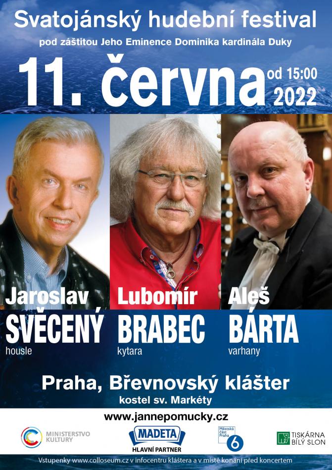 Festivalový koncert houslového virtuóza Jaroslava Svěceného a kytaristy Lubomíra Brabce, je doplněn o sólové vstupy našeho nejrenomovanějšího varhaníka Aleše Bárty. Koncert se uskuteční v sobotu 11. června 2022 v 15.hod v Břevnovském klášteře v kostele sv. Markéty . Jedná a se o zahajovací koncert Svatojánského hudebního festivalu pod patronací Jeho Eminence Dominika kardinála Duky, arcibiskupa pražského ve spolupráci s Městským úřadem Prahy 6. Vstupenky zakoupíte na www.colosseumticket.cz, v areálu Břevnovského kláštera v infocentru. Zbylé vstupenky můžete také zakoupit hodinu před koncertem v místě konání.