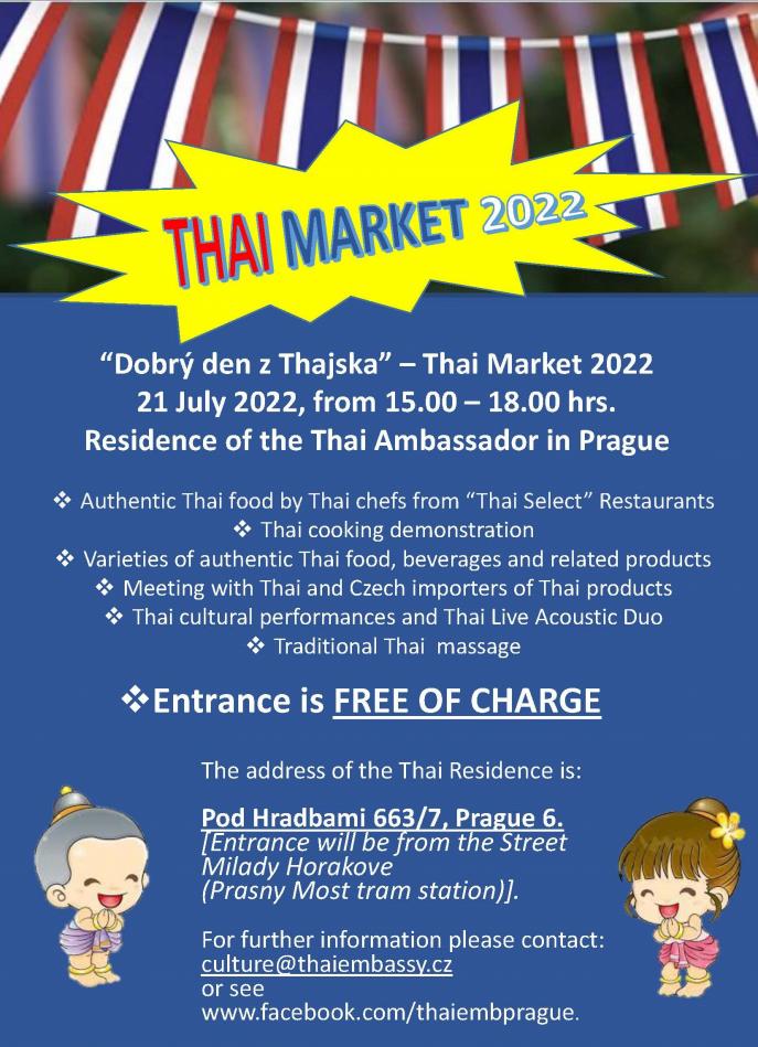 The Royal Thai Embassy in Prague, in cooperation with the Thai Trade Center in Prague and the Tourism Authority of Thailand, Prague Office, cordially invites you to “Dobry den z Thajska”: Thai Market 2022 which will take place on Thursday, 21 July 2022 between 15.00 – 18.00 hours at the Garden of the Thai Ambassador’s Residence in Prague.