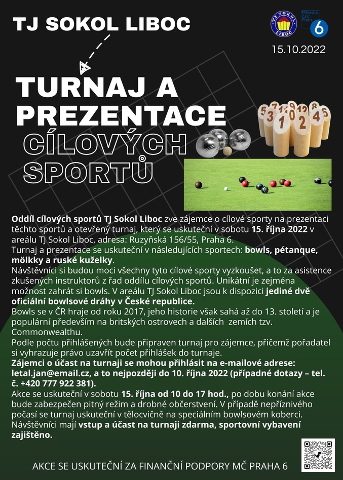 V areálu TJ Sokol Liboc se uskuteční v sobotu 15. října 2022 turnaj a prezentace v následujících sportech : bowls, petanque, molkky a ruské kuželky. Návštěvníci si budou moci všechny tyto cílové sporty vyzkoušet, unikátní je zejména možnost zahrát so bowls.