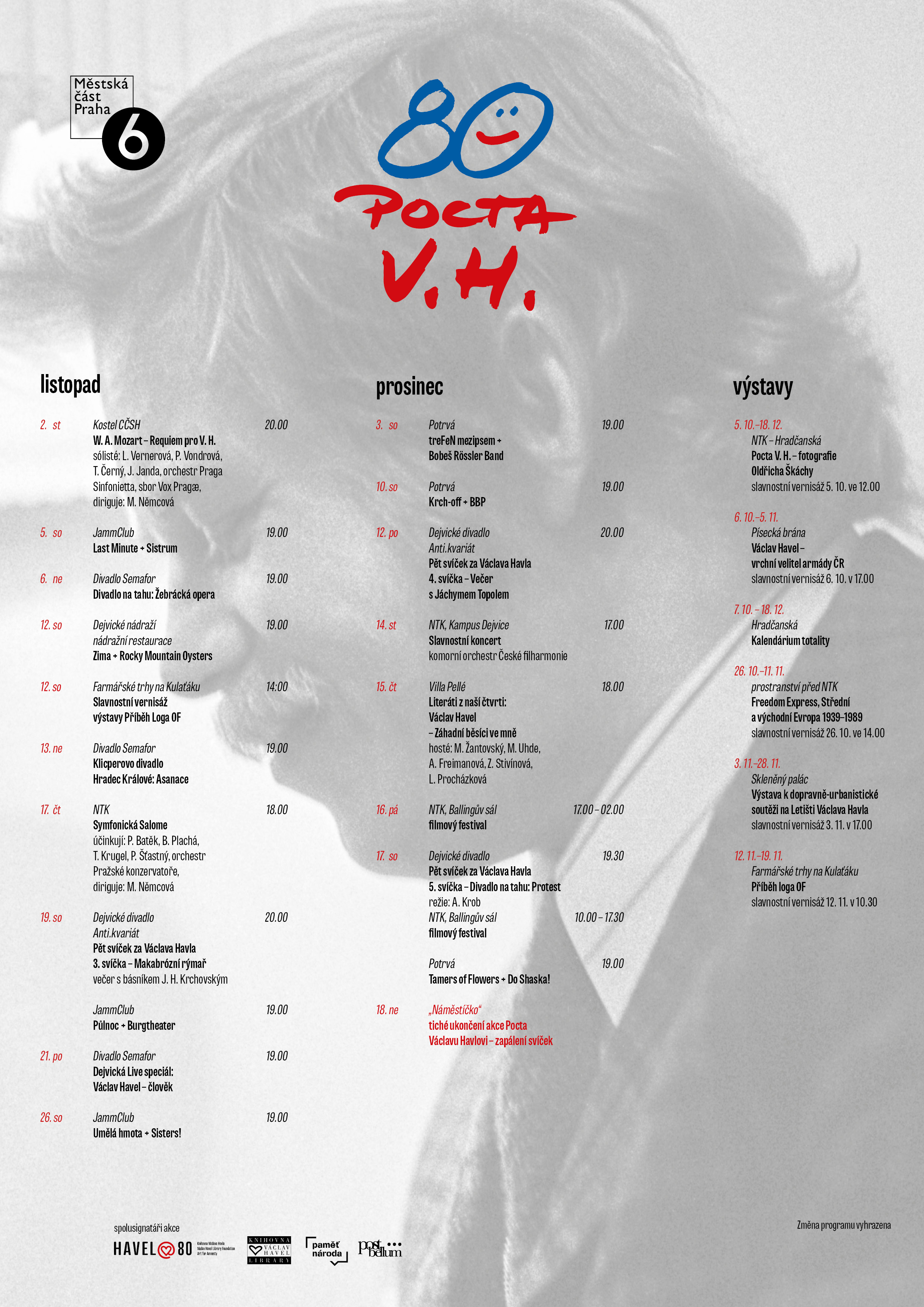 Václav Havel by se v letošním roce dožil osmdesátých narozenin. Městská část Praha 6 se ve spolupráci s Knihovnou Václava Havla a organizací Post Bellum rozhodla vytvořit multižánrový projekt „Pocta Václavu Havlovi“ na Praze 6. Projekt bude probíhat od 5. října do 18. prosince. „Poctu Václavu Havlovi“ pořádá Praha 6 ve spolupráci s Knihovnou Václava Havla a organizací Post Bellum.