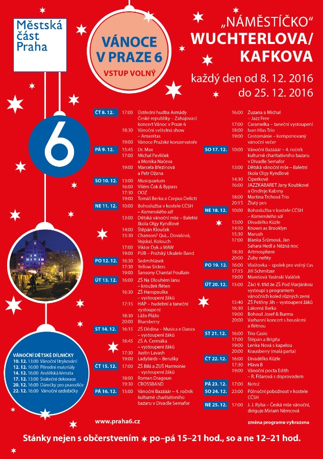 MČ Praha 6 pořádá již podruhé na „Náměstíčku“ více jak 14 ti denní pásmo vánočních akcí pro děti i dospělé. Součástí kulturního programu budou také stánky s občerstvením. Velké množství doprovodného programu, včetně hudebních a tanečních vystoupení, kulturně charitativních bazarů, školních vystoupení a pro nejmenší dětské dílničky. Přijďte si vychutnat opravdové Vánoce na Prahu 6.