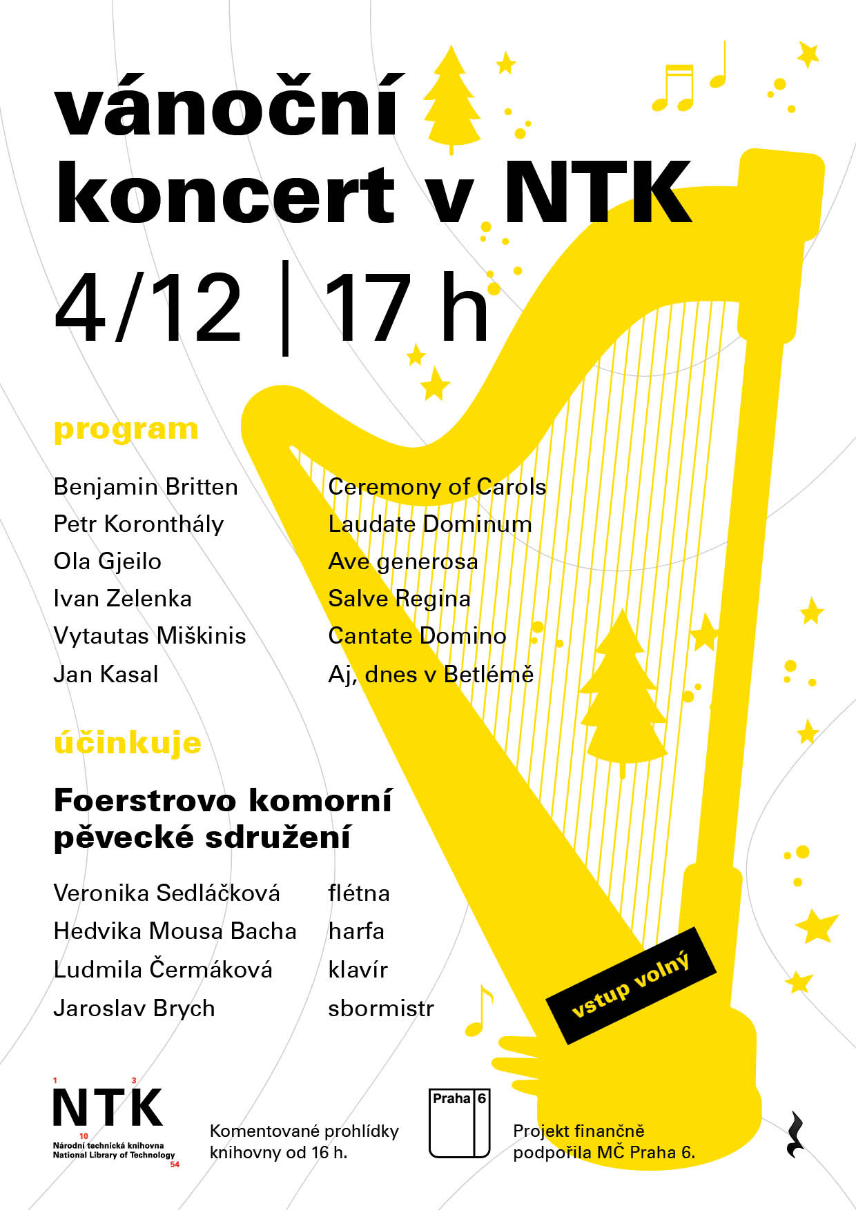 Národní technická knihovna a městská část Praha 6 Vás zvou na tradiční vánoční koncert. Vystoupí Foerstrova komorní pěvecké sdružení za doprovodu harfy, klavíru a flétny. Koncert se uskuteční ve čtvrtek 4. prosince 2025 od 17 hodin v Hale služeb.
