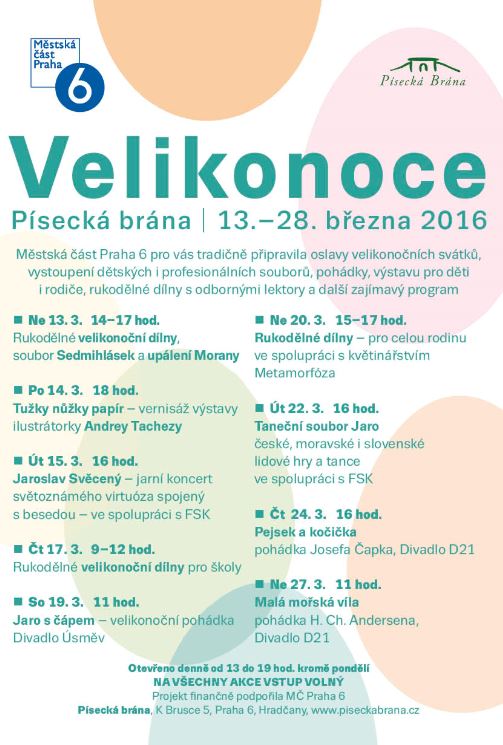 Velikonoce v Písecké bráně podpořila městská část Praha 6 částkou 100 000 Kč v rámci dotačního programu Kultura 2016.