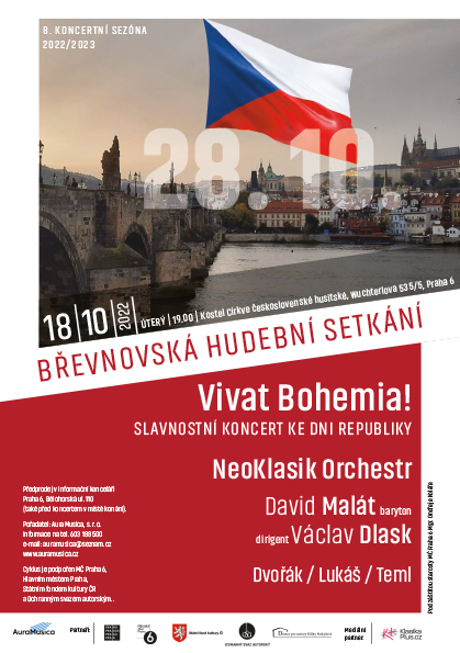 Každoročně v říjnovém koncertu připomínáme významný den – vznik Československé republiky 28. října 1918. Stejně tomu bude v následujícím koncertu 8. ročníku Břevnovských hudebních setkání, který se uskuteční v úterý 18. října 2022 v 19.00 hodin v Kostele Církve československé husitské (Wuchterlova 5, Praha 6). Vystoupí NeoKlasik Orchestr, který založil dirigent Václav Dlask v roce 2020 se zaměřením na interpretaci neoklasicistních děl a dalších skladeb 20. a 21. století, které odkazují na dobové hudební styly.