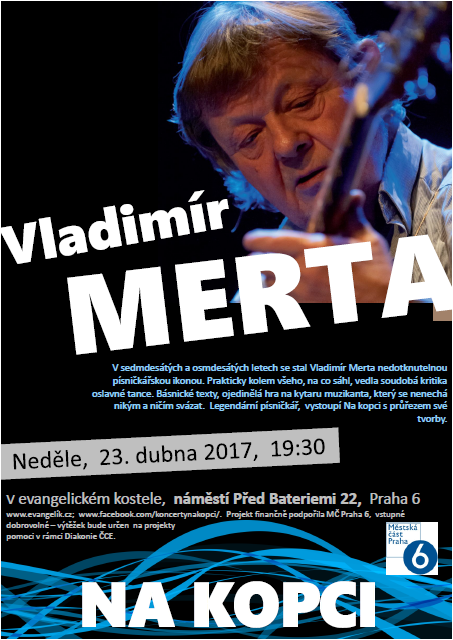 Vladímír Merta, legendární písničkář vystoupí v rámci koncertů Na kopci 23. 4. 2017 v 19.30 hodin.