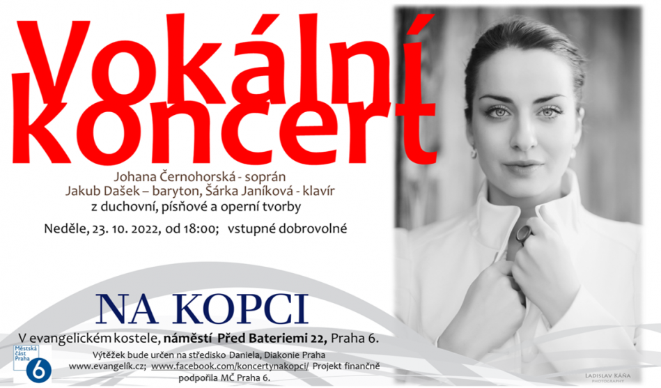 Zveme na vokální koncert, který proběhne v rámci Koncertů Na kopci. Skladby z duchovní, písňové a operní tvorby přednesou Johana Černohorská - soprán; Jakub Dašek - baryton; Šárka Janíková - klavír.
