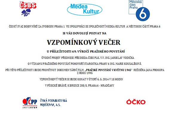 ČESKÝ SVAZ BOJOVNÍKŮ ZA SVOBODU PRAHA 1 VE SPOLUPRÁCI SE SPOLEČNOSTÍ MEDEA KULTUR A MĚSTSKOU ČÁSTÍ PRAHA 6 SI VÁS DOVOLUJÍ POZVAT NA VZPOMÍNKOVÝ VEČER U PŘÍLEŽITOSTI 69. VÝROČÍ PRAŽSKÉHO POVSTÁNÍ.