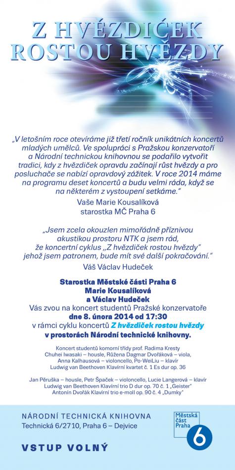 Starostka městské části Praha 6 Marie Kousalíková a Václav Hudeček Vás zvou na koncert studentů Pražské konzervatoře.