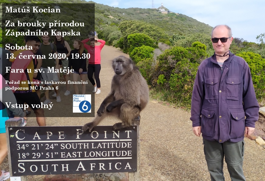 Promítání reportáže z entomologické expedice do Západního Kapska (JAR). Fara u sv. Matěje, U Matěje 2, Praha-Dejvice. Vstup volný, Délka pořadu 55 min.