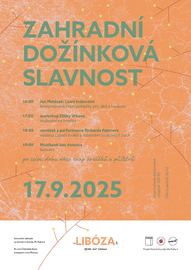 Srdečně zveme na Zahradní dožínkovou slavnost v komunitní zahradě Libóza. Společně se ohlédneme za uplynulou sezónou a patřičně ji oslavíme bohatým programem.![]()
