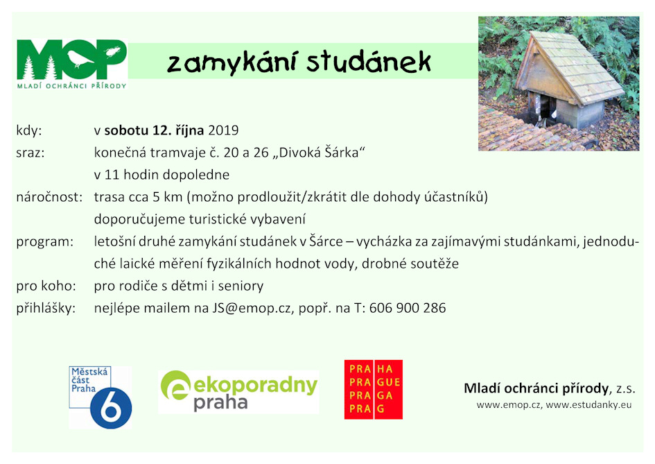 Vycházka po studánkách v Šárce (trasu cca 5 km možno prodloužit / zkrátit dle dohody účastníků) pro rodiče s dětmi i seniory. Součástí bude i jednoduché laické měření fyzikálních hodnot vody, drobné soutěže... Kapacita akce je omezená, přihlašte se! Akce je dílčí částí projektu podpořeného MČ Praha 6, vstup je zdarma.