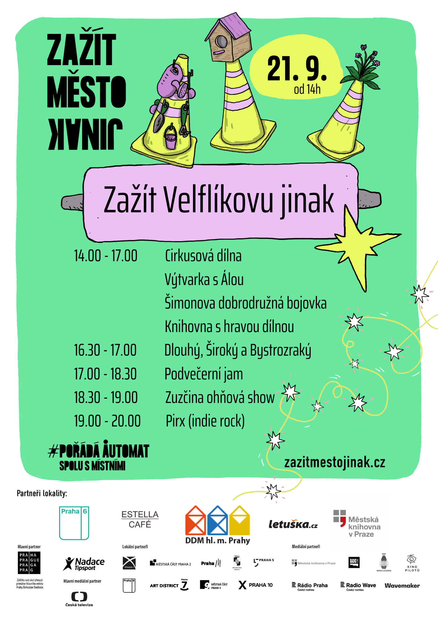 Z bohatého programu vybíráme jamování, které bude tím lepší, čím víc vás přijde s nástrojem – vytáhněte kytáry, rachtadla, píšťalky a hřebeny! Na koho bude tónů příliš, zmizí do okolí na bojovku. Pro velký úspěch dáváme repete výtvarky s Alenkou i cirkusové dílny, naši divadelní stage letos poskytneme profíkovi Martinovi Matejkovi s K. J. Erbenem a nově přivítáme paní knihovnici se zmatlíkovským programem. O koncert se postará partička lektorů z DDM pod Juliskou a o to hlavní – občerstvení – pizzař Michal a místní pekaři ve spojení s pivem z Kročehlav.