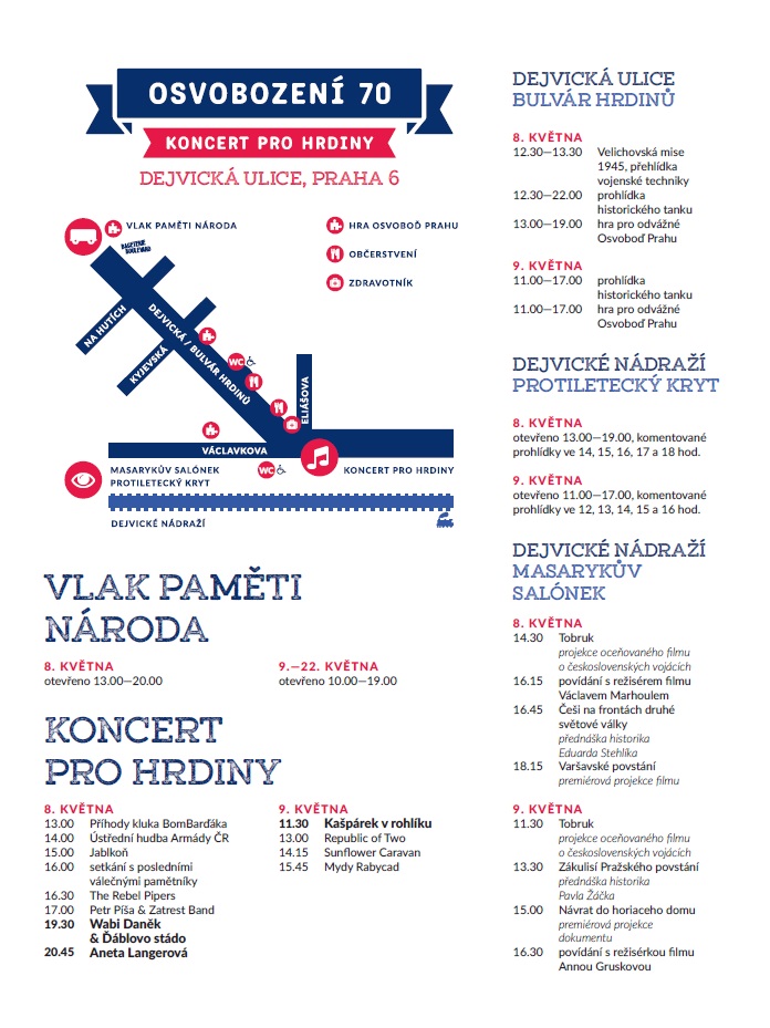 Jsem si vědom, že akce samotná, ale i její přípravná fáze a likvidace, bude znamenat zásah do komfortu Vašeho bydlení na Dejvické a v přilehlých ulicích. Věřím však, že výjimečnost a ojedinělost 70. výročí ukončení 2. světové války pochopíte. Dovoluji si Vás tedy poprosit o toleranci k akci „Osvobození 70“ od čtvrtka 7. 5. (od 8.00) do 9. 5. (do 23.59). Vlastní program bude probíhat v pátek 8. 5. (12.00— 22.00) a v sobotu 9. 5. (11.00—17.00). Na Dejvické třídě bude k dispozici občerstvení formou stánkového prodeje.