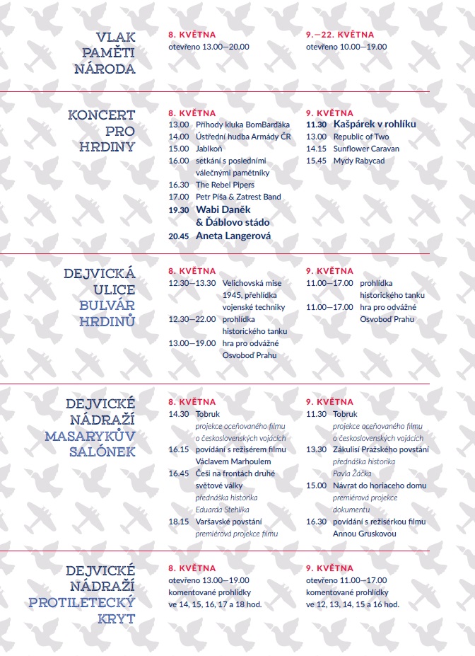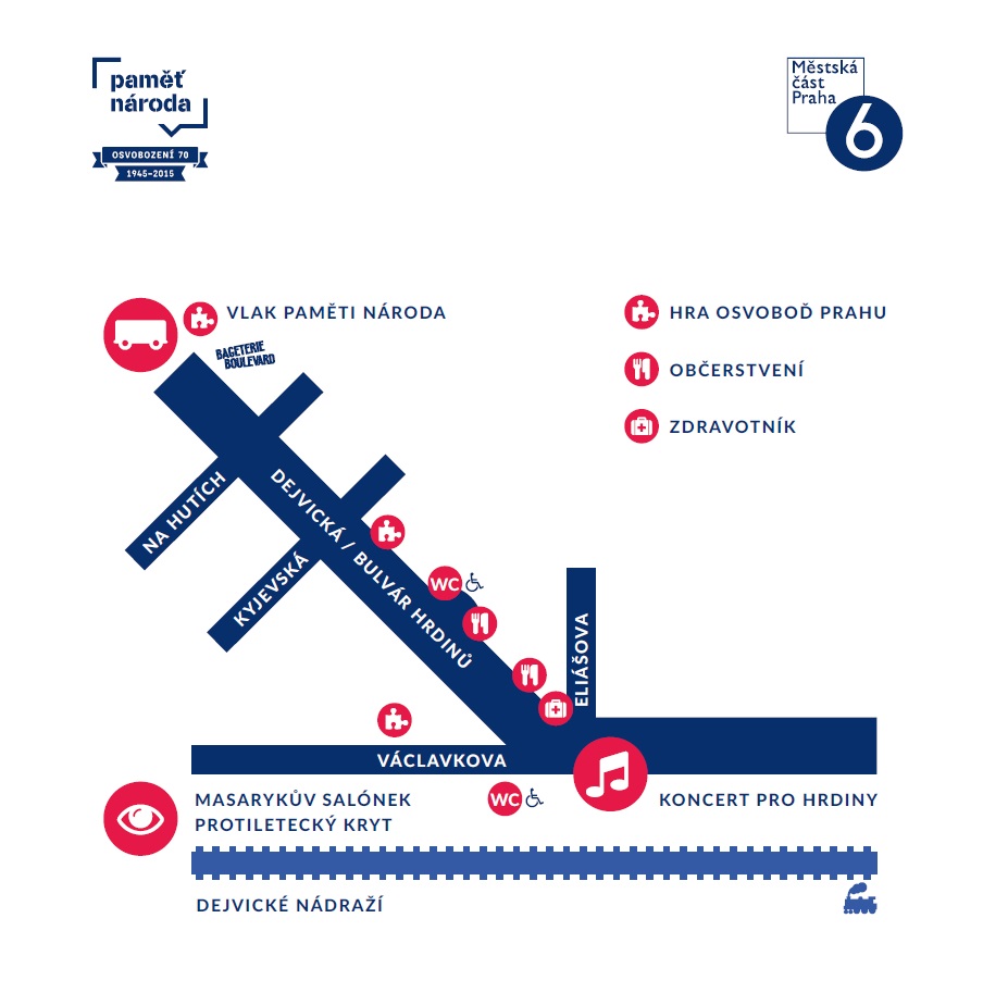 Posledním válečným veteránům bude možné složit poklonu během Osvobození 70 - ojedinělé akce, kterou si připomínáme 70 výročí konce druhé světové války. Dejvická ulice se promění v Bulvár hrdinů, na Vítězném náměstí bude stát Vlak Paměti národa – historický vagón s multimediální instalací, na Dejvickém nádraží bude možné zajít na válečný film nebo do protileteckého krytu.