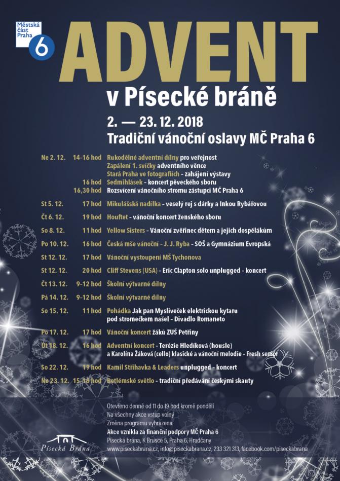 Písecká brána za podpory městské části Praha 6 pořádá tradiční vánoční oslavy Advent v Písecké bráně, které se uskuteční od 2. do 23. prosince 2018. Vstup na všechny akce je volný.