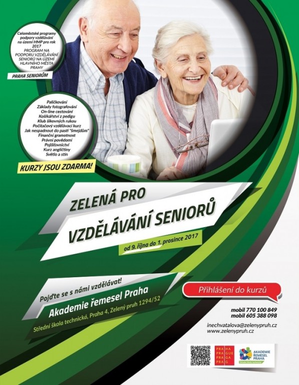 Celoměstské programy podpory vzdělávání pro seniory na území hl. m. Prahy pro rok 2017 - jde o vzdělávací kurzy zdarma určené pro seniory z celé Prahy. Podrobné informace naleznete zde