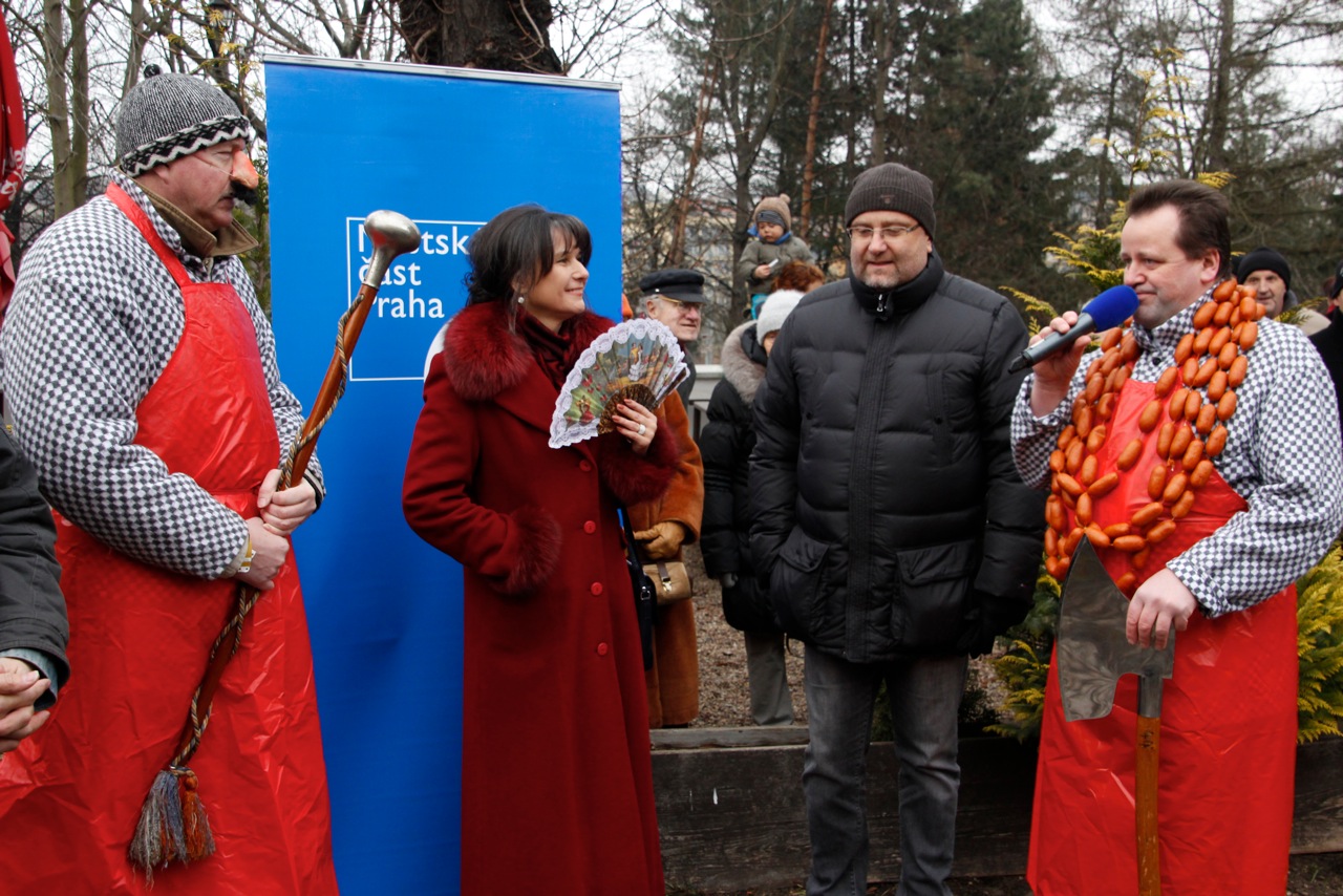 Krátce po čtvrté hodině odpoledne se celý průvod v čele s masopustními maskami vydal Bělohorskou ulicí k hotelu Pyramida, kde byla pochována basa. Hudebníci, masky a všichni v průvodu se i letos mohli na konci průvodu těšit na pravou českou zabijačku a pro děti bylo lákadlem divadlo,žonglérská škola kejklíře Vítka a na závěr večera jeho ohňová masopustní show.
