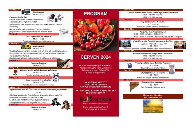 V programu komunitního seniorského centra Šlejnická (ul. Šlejnická 5, Praha 6) na červen 2024 naleznete různé aktivizační programy jako odborné kurzy, paměťová cvičení, kulturní programy atd. Aktivity jsou určeny pro seniory městské části Praha 6 a jsou zdarma. Místa je lépe si zarezervovat u paní Simeonové na tel: 736 489 330.