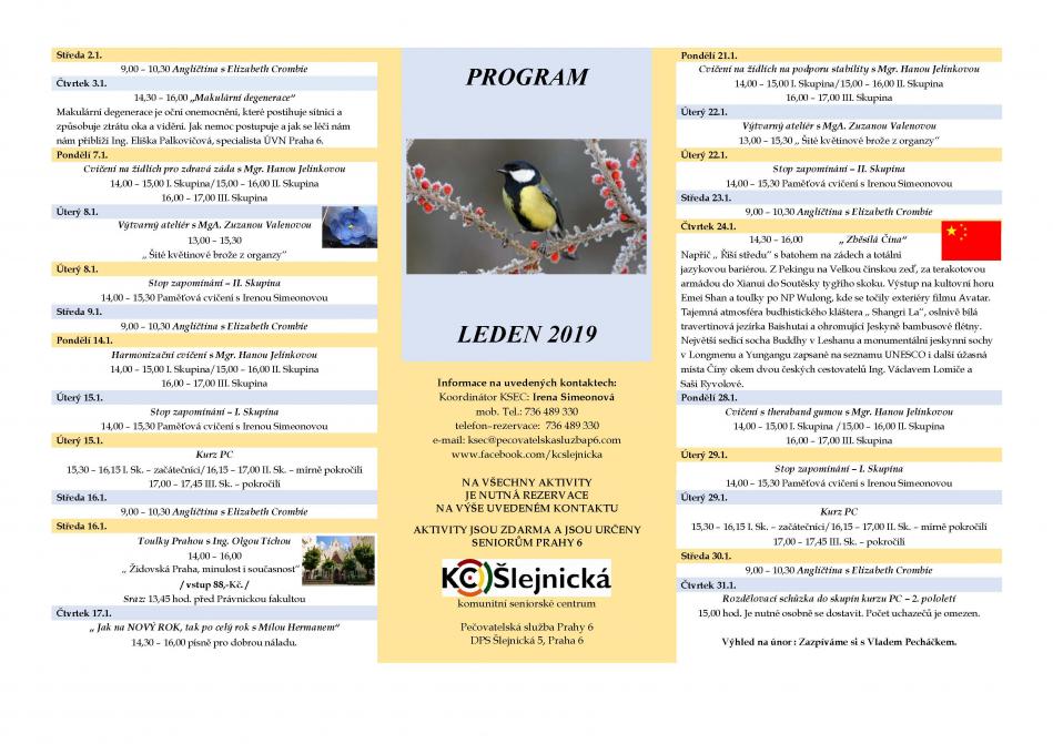 V programu Komunitního seniorského centra Šlejnická (ul. Šlejnická 5, Praha 6) na Leden 2019 naleznete různé aktivizační programy jako odborné kurzy, paměťová cvičení, výuka anglického jazyka. Aktivity jsou určeny pro seniory Městské části Praha 6 a jsou zdarma. Místa je lépe si zarezervovat u paní Simeonové na tel: 736 489 330.