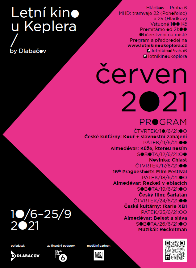 Program Letního kina u Keplera startuje ve čtvrtek 10. června českou kultovní klasikou Kouř od Tomáše Vorla. Slavnostního zahájení se zúčastní hlavní herečtí protagonisté filmu. Den na to kino divákům nabídne psychologické drama od Pedra Almodóvara Kůže, kterou nosím a sobotní večer bude patřit oceňované novince Chlast. To vše na novém, 7 x 4 metry velkém plátně, který Praha 6 letos kinu koupila.