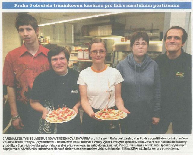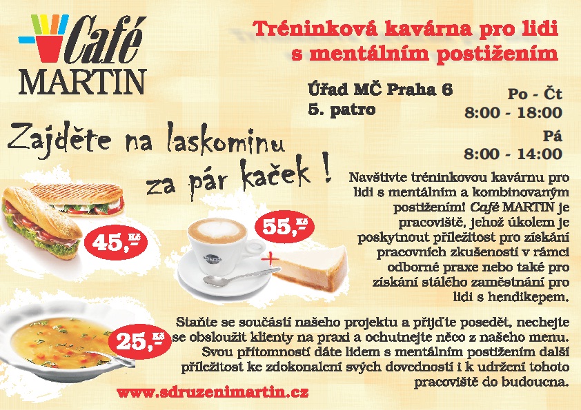 Už několik let v Praze fungují speciální tréninkové kavárny, které zaměstnávají lidi s různým postižením. Jedna taková byla nyní otevřena v budově úřadu Prahy 6. V kavárně Café Martin pracují lidé s mentálním postižením.