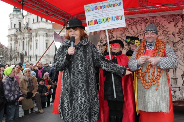 Průvod karnevalových masek vyrazil z Clam – Gallasova paláce směrem k Orloji, kde paní starostka Marie Kousalíková předala slavnostně této družině symbolickou vládu nad městem. Poté se celý průvod v čele s králem karnevalu a zástupci MČ Praha 1 a MČ Praha 6 přesunul na Staroměstské náměstí. Zde se představili zástupci masek z jednotlivých pražských městských části a již tradičně zvali z pódia na Staroměstském náměstí na své lokální masopusty.