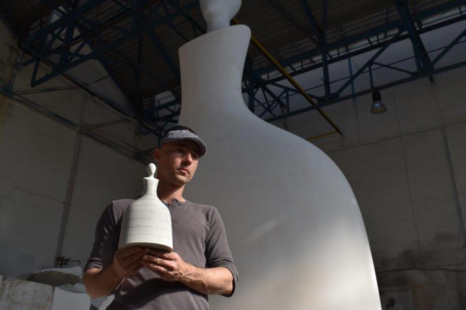 Z polystyrenového modelu se nyní bude snímat zhruba čtyřicetidílná forma. Následně se původní model zbrousí o sílu finálního materiálu, který přijde mezi formu a jádro sochy. „Výdusek bude z geopolymerní směsi, lze ji přirovnat k umělému kameni,“ vysvětluje autor sochy, který na díle intenzivně pracuje poslední rok. Desetinový model postupně zvětšoval a upravoval až do současné podoby 1:1. Finální výdusek pak bude vznikat přímo v místě, kde bude socha umístěna. Tam se momentálně již připravují základy, které osmitunovou sochu podrží.