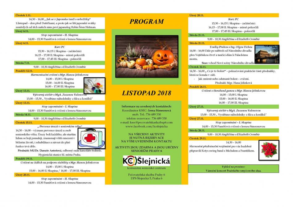 V programu Komunitního seniorského centra Šlejnická (ul. Šlejnická 5, Praha 6) na Listopad 2018 naleznete různé aktivizační programy jako odborné kurzy, paměťová cvičení, výuka anglického jazyka. Aktivity jsou určeny pro seniory Městské části Praha 6 a jsou zdarma. Místa je lépe si zarezervovat u paní Simeonové na tel: 736 489 330.