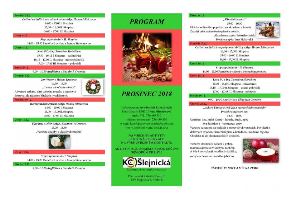 V programu Komunitního seniorského centra Šlejnická (ul. Šlejnická 5, Praha 6) na Prosinec 2018 naleznete různé aktivizační programy jako odborné kurzy, paměťová cvičení, výuka anglického jazyka. Aktivity jsou určeny pro seniory Městské části Praha 6 a jsou zdarma. Místa je lépe si zarezervovat u paní Simeonové na tel: 736 489 330.