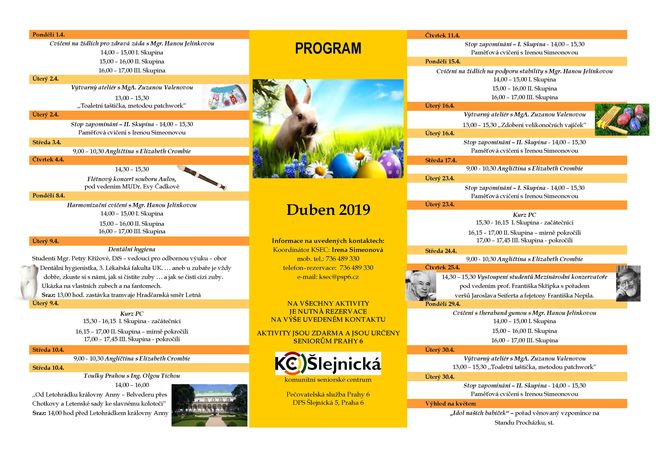 V programu Komunitního seniorského centra Šlejnická (ul. Šlejnická 5, Praha 6) na Duben 2019 naleznete různé aktivizační programy jako odborné kurzy, paměťová cvičení, výuka anglického jazyka. Aktivity jsou určeny pro seniory Městské části Praha 6 a jsou zdarma. Místa je lépe si zarezervovat u paní Simeonové na tel: 736 489 330.