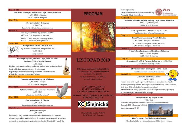 V programu Komunitního seniorského centra Šlejnická (ul. Šlejnická 5, Praha 6) na Listopad 2019 naleznete různé aktivizační programy jako odborné kurzy, paměťová cvičení, kulturní programy, atd. Aktivity jsou určeny pro seniory Městské části Praha 6 a jsou zdarma. Místa je lépe si zarezervovat u paní Simeonové na tel: 736 489 330.