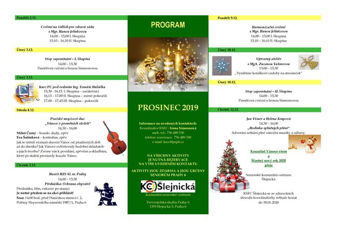 V programu Komunitního seniorského centra Šlejnická (ul. Šlejnická 5, Praha 6) na Prosinec 2019 naleznete různé aktivizační programy jako odborné kurzy, paměťová cvičení, kulturní programy, atd. Aktivity jsou určeny pro seniory Městské části Praha 6 a jsou zdarma. Místa je lépe si zarezervovat u paní Simeonové na tel: 736 489 330.
