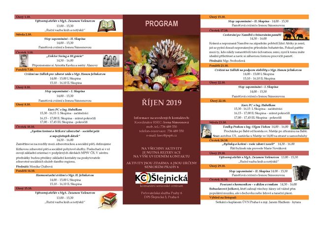 V programu Komunitního seniorského centra Šlejnická (ul. Šlejnická 5, Praha 6) na Říjen 2019 naleznete různé aktivizační programy jako odborné kurzy, paměťová cvičení, kulturní programy, atd. Aktivity jsou určeny pro seniory Městské části Praha 6 a jsou zdarma. Místa je lépe si zarezervovat u paní Simeonové na tel: 736 489 330.