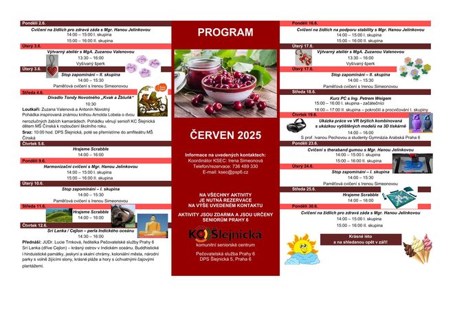 V programu komunitního seniorského centra Šlejnická (ul. Šlejnická 5, Praha 6) na červen 2025 naleznete různé aktivizační programy jako odborné kurzy, paměťová cvičení, kulturní programy atd. Aktivity jsou určeny pro seniory městské části Praha 6 a jsou zdarma. Místa je lépe si zarezervovat u paní Simeonové na tel: 736 489 330.