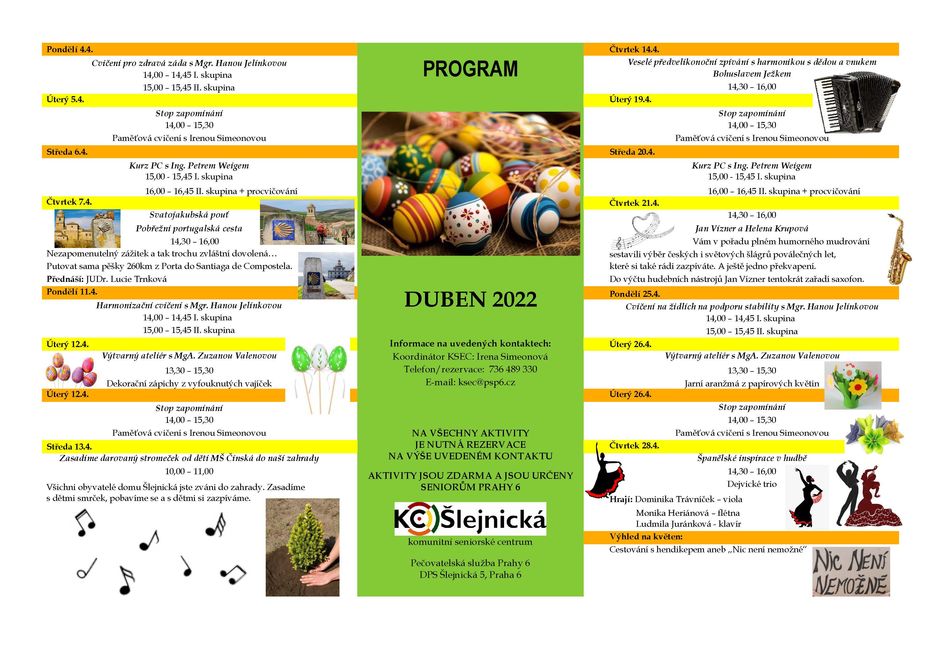 V programu komunitního seniorského centra Šlejnická (ul. Šlejnická 5, Praha 6) na Duben 2022 naleznete různé aktivizační programy jako odborné kurzy, paměťová cvičení, kulturní programy, atd. Aktivity jsou určeny pro seniory městské části Praha 6 a jsou zdarma. Místa je lépe si zarezervovat u paní Simeonové na tel: 736 489 330.