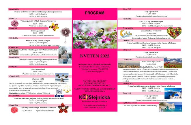 V programu komunitního seniorského centra Šlejnická (ul. Šlejnická 5, Praha 6) na Květen 2022 naleznete různé aktivizační programy jako odborné kurzy, paměťová cvičení, kulturní programy, atd. Aktivity jsou určeny pro seniory městské části Praha 6 a jsou zdarma. Místa je lépe si zarezervovat u paní Simeonové na tel: 736 489 330.