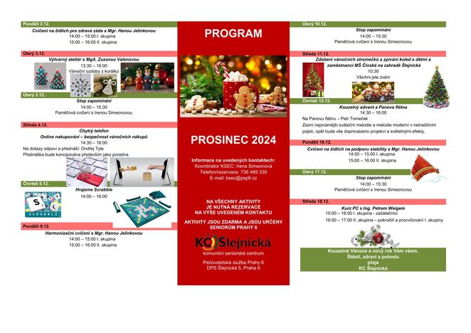 V programu komunitního seniorského centra Šlejnická (ul. Šlejnická 5, Praha 6) na prosinec 2024 naleznete různé aktivizační programy jako odborné kurzy, paměťová cvičení, kulturní programy atd. Aktivity jsou určeny pro seniory městské části Praha 6 a jsou zdarma. Místa je lépe si zarezervovat u paní Simeonové na tel: 736 489 330.