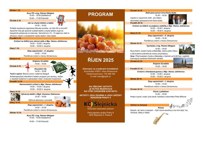 Program komunitního seniorského centra Šlejnická na říjen 2025