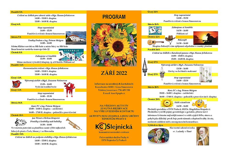 V programu komunitního seniorského centra Šlejnická (ul. Šlejnická 5, Praha 6) na Září 2022 naleznete různé aktivizační programy jako odborné kurzy, paměťová cvičení, kulturní programy, atd. Aktivity jsou určeny pro seniory městské části Praha 6 a jsou zdarma. Místa je lépe si zarezervovat u paní Simeonové na tel: 736 489 330.