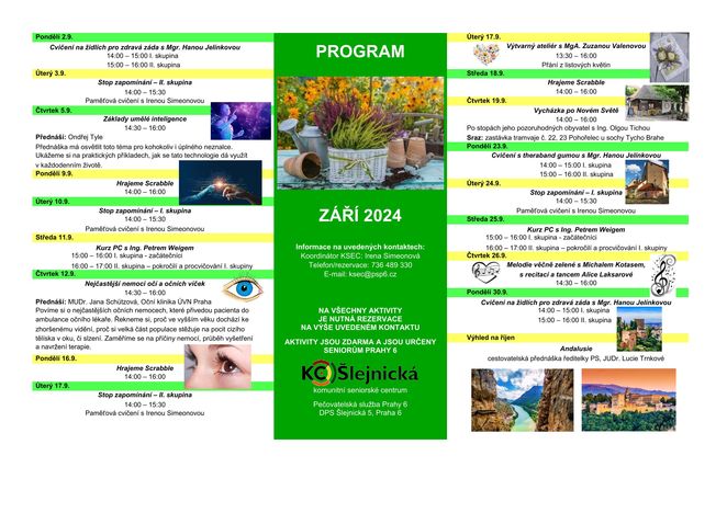 V programu komunitního seniorského centra Šlejnická (ul. Šlejnická 5, Praha 6) na září 2024 naleznete různé aktivizační programy jako odborné kurzy, paměťová cvičení, kulturní programy atd. Aktivity jsou určeny pro seniory městské části Praha 6 a jsou zdarma. Místa je lépe si zarezervovat u paní Simeonové na tel: 736 489 330.