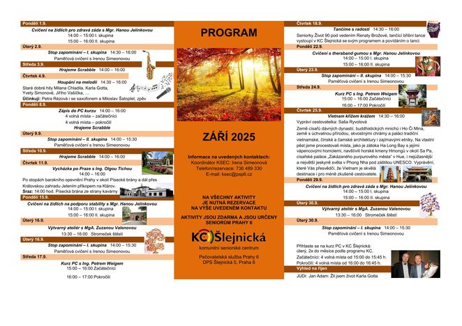 V programu komunitního seniorského centra Šlejnická (ul. Šlejnická 5, Praha 6) na září 2025 naleznete různé aktivizační programy jako odborné kurzy, paměťová cvičení, kulturní programy atd. Aktivity jsou určeny pro seniory městské části Praha 6 a jsou zdarma. Místa je lépe si zarezervovat u paní Simeonové na tel: 736 489 330.
